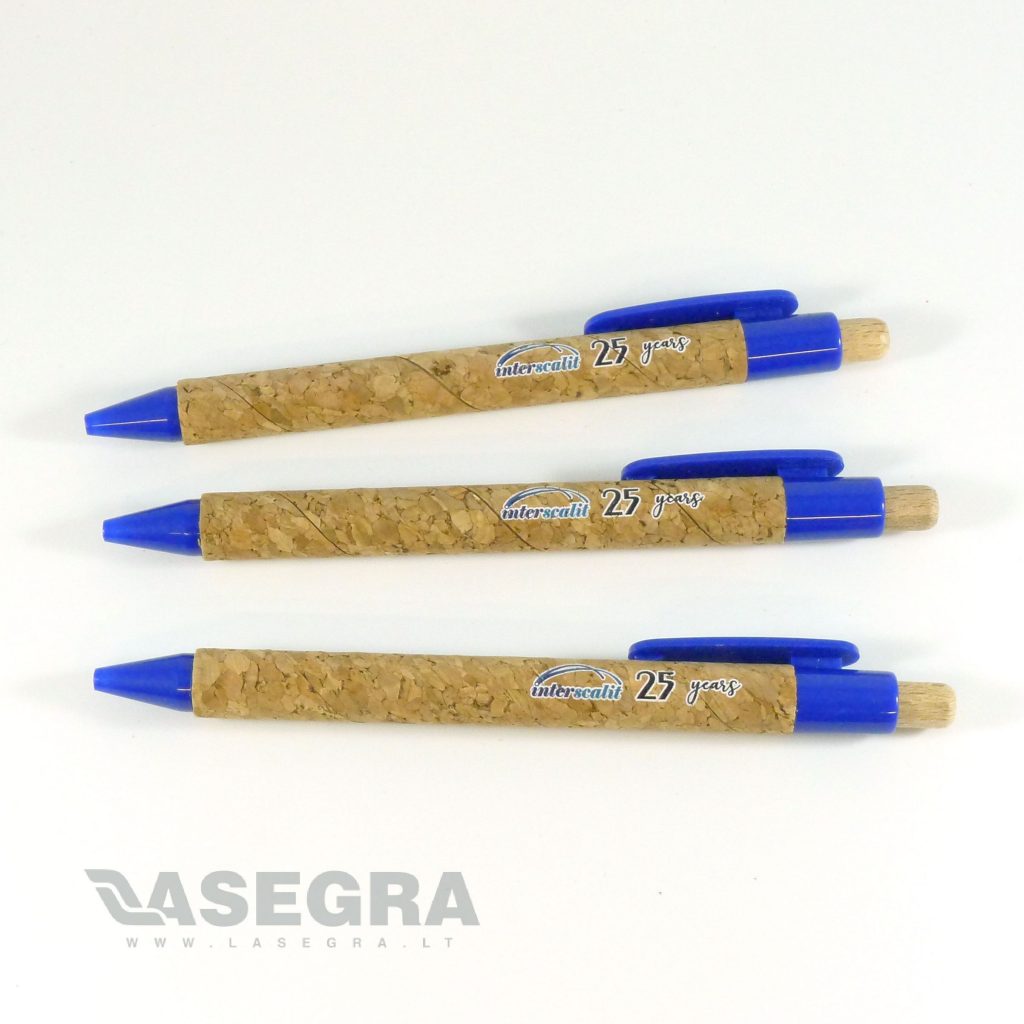 KORTE perdirbtas rašiklis. Korpusas pagamintas iš natūralios kamštinės medžiagos, o mygtukas – iš medžio.